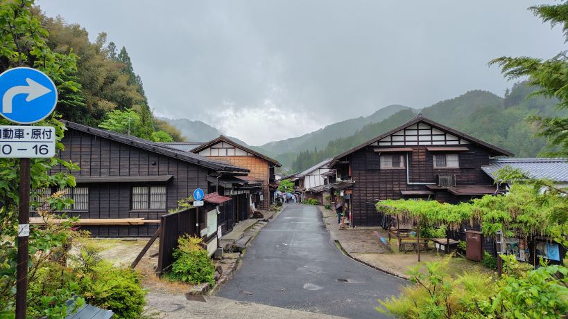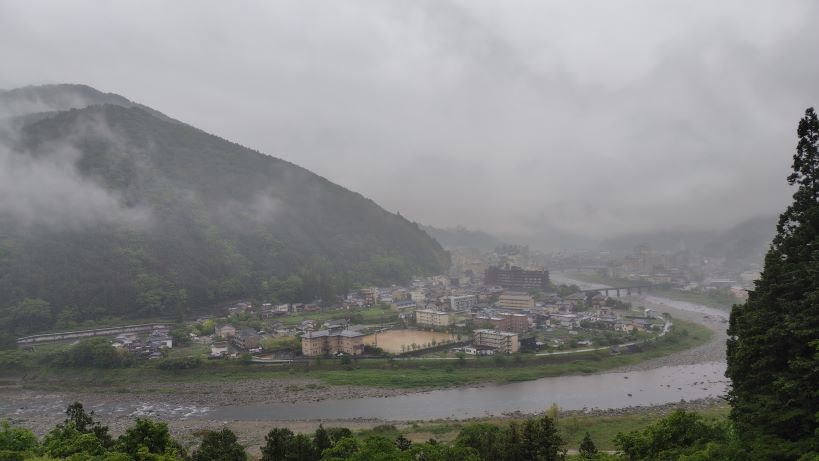 昨日の続き。 今回のツアー参加の目的は、飛騨高山と、馬籠・妻籠見学。 馬籠は島崎藤村の出身地として知られる。 「夜明け前」は読んだことがあるが、行ってみると全くイメージが違っていた。 狭い坂道沿いに建物が並んでいるところだった。 もっと広い開けた土地が舞台だと思っていた。 街道沿いの地域だけが繁華で、あとは農村だったのだろう。 坂を登ったところにある展望台からの眺め。 晴れていたら見事な眺望だろうが、雨でも趣はある。 まさに「木曾路はすべて山の中である」という景色だった。