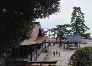 延暦寺に続いて、琵琶湖畔の白鬚神社へ。 この神社のことは全く知らなかったのだが、なかなか立派な神社だった。 琵琶湖に鳥居が発っているのだが、神社との間に道路があり、近くには行けないのが残念。 紫式部の歌碑。このあたりを通りかかったときの者で、都が恋しいというもの。 公式サイト