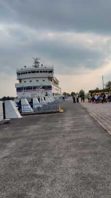 竹生島からの帰りは長浜港へ。 港に着くと大木に船が泊まっていた。 滋賀県の小学生は、必ず、琵琶湖で船に一泊する行事があると聞いていたので、案内してくれた人に聞いてみたら、思った通りだった。 五年生の時に一泊するのだそうだ。