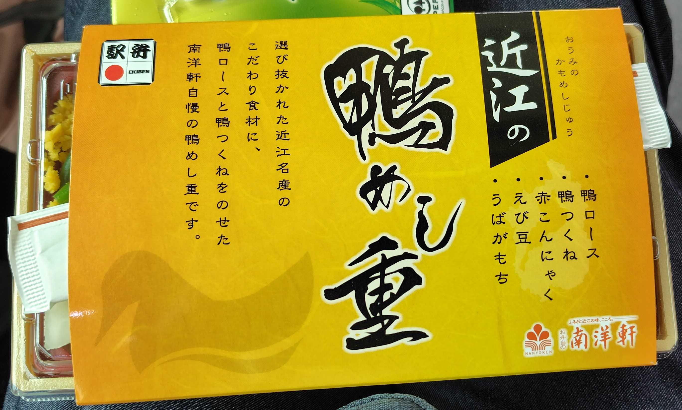 二日目は昼食を食べる場所や買う場所がないということで、事前に弁当の予約を取っていた。 食べ損ねるのは困るので、注文しておいた。 道の駅で業者から受け取ったのは「鴨めし重弁当」というもの。 外観はこんなもの。 食べてみたら、これが意外によくできている。 滋賀県名物の「えび豆」や「赤こんにゃく」が入っているだけでなく、甘いものもついている。 よくできていて満足。