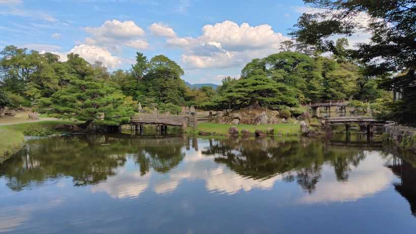 彦根城天守閣見学の後は玄宮園へ。 ここも城内ではあるので彦根城の一部なのだが、観光地としては、この庭園を天守閣とは別にしている。 案内を聞きながら巡って思ったのは、「見立て」が大事だということ。 島や岩を鶴や亀に見立てることによって造園の意図を読み取るような仕掛けになっている。 池に映る天守閣。 不思議なのは、城跡の随所にトイレがあるのに、玄宮園にはトイレがないこと。