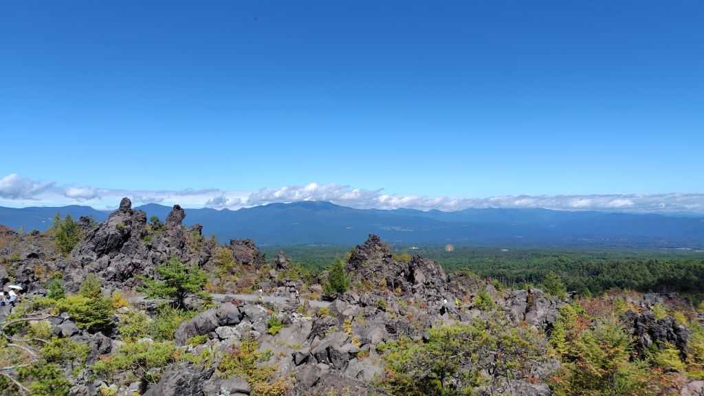 今回のツアーで最も魅力を感じたのはこの鬼押出し園。 想像以上に広い敷地で全部は回れなかった。 高地にあり、眺めが良かった。 ヒカリゴケが自生しているのだった。 写真ではわかりにくいが、ほのかに、光を反射して見える。 あまり穴に近づいてしまうと光が入らないので見づらくなる。 少し離れてみた方がよく見える。 昼食は鬼押出し園で。地元の食材を使った和食膳。おいしいのだが、朝食のバイキングでたらふく食べたので食べきれない。もったいないが天ぷらは残してしまった。 あとでレストランを外から見たら、このように張り出した建物だった。