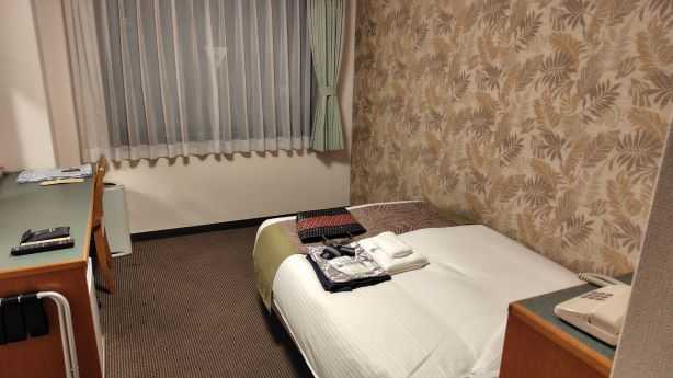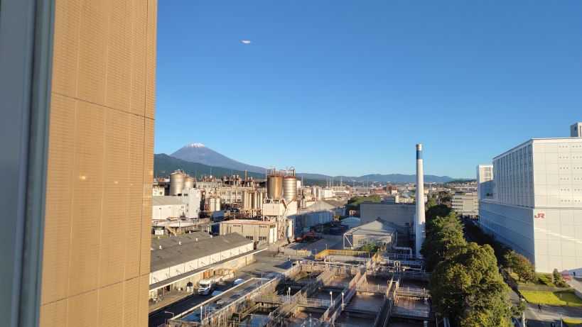 三島で泊まったのは、東横INN富士山三島駅。 スマートEXのパックで予約した。 駅から近いのはいいのだが、前に書いたように、三島駅の北口と南口は行き来できないので、北口側にあるこのホテルに泊まると不便。ホテルで南口までの無料バスを出してはいるが、不便であることに変わりはない。 部屋によっては富士山が見えるはず。私の部屋からは見えず、廊下からは写真のように富士山が見えた。 部屋は広くはないがベッドは大きい。ゆったりしている。 建物は新しい。 枕元にコンセントはないが、延長コードが置いてあって、不便は感じない。 無料の朝食が付いているのが最大の魅力。 豪華なバイキングではないが、朝食としては十分。 2階の朝食会場で食べるのだが、パンとコーヒーだけでいいなら1階のフロントでも簡単に食べられる。 フロントで新聞が読めるのも良かった。