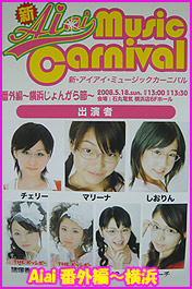 新Aiaiミュージックカーニバル番外編が石丸横浜店で行われた。ゲスト:THE ポッシボー(もろりん・ごとぅー)出演:チェリー・マリーナ・しおりんMC:カレン・ピーチ 行く途中、新高島を通る・・・BLITZで開催された初単独コンの事を思い出しながら横浜店へ向かう!到着後、案内されるまで暫し歓談(笑)6階会場に入ったら演歌が流れているじゃないですか~ そして壁にはいままで来店した演歌歌手の方々のポスターがサイン入りで張ってある。(^^)この店舗では演歌に力を入れているようだ~オープニングはカレンのズンドコ節!歌いながらなんと後の出入り口から登場し(笑)ステージへと向かう・・・その後恋するニワトリ~ピーチ・チェリー そよ風のくちづけ~しおりん・カレン・マリーナ ニワトリの時・・・PAトラブルで曲が途切れてしまい仕切りなおしとなったのだがもう1回多く歌えるから嬉しいって(笑)ピーチ・チェリーよかったね(^^)そして呼び込みによりもろりんとごとぅーがキャピポシ写真集の衣装で登場!NANANA女道金魚すくいと花火大会立川イベではハブられたが(笑) 今回は完璧に踊りをこなしたもろりん! ほんと頑張ってたよ~そして何よりめっちゃ楽しそうだった。 エンディングは全員でヤングDAYS!!やっぱりYDは盛り上がるね~自分もトレイン組んで連結(笑)それとピーチが7月10日に なっとうソングでデビューとか! 納豆大好きのもろりんにも歌ってもらいたいなぁ(笑)横浜で行われた久しぶりのAiaiめっちゃ楽しいイベだった(^^)