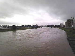 ニュースで知ったかも知れませんが、名古屋はピンチでした。一時47万世帯、109万人に対して避難指示・避難勧告が出されましたから。実に、人口の半分です。鉄道網は壊滅状態。国道沿いは、帰宅難民が溢れていました。もちろん、私も歩きましたよ。ユニクロで短パン、サンダルを買い込んで準備万端。ボタンダウンシャツ姿だけど、そんなに違和感なさそう?大雨にも負けず、3時間歩きました。都心部と郊外の間に大きな河川があって、これがヤバかった。まず、矢田川。河川敷のジョギングコースは全水没です。緑いっぱいの遊水地も見えません。次に、庄内川。昨日も走った堤防道路を越えそう。見づらいですが、向こうに見える橋げたは、JR中央線。これはヤバイ。もう少し上流地域では、この庄内川が氾濫したと言っていました。堤防が崩れたのではなく、堤防から溢れ出ました。庄内川を渡ると、いきなり水没地域に突入。低地にあるボーリング場などに、お客さんが取り残されていました。私の地元は高台にあり、水害の恐れはありません。でも、大きな河川を渡らないと名古屋へ行けないんだよなあ。そんなことで、2ヶ月ぶりの更新でした。
