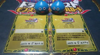 こんばんは~です。今日も蒸し蒸し暑い日でした。今日は相方がお休みだったので、久しぶりにドラクエの大会に行ってきました。Vジャンプカップもあったのですけど、我が家は通常のペア戦に行ってきました。会場で、マジンブーZさんともお会いできて、少しでしたがお話できて嬉しかったです。エントリーは16組。おっ、少ないぞ。でも我が家少なすぎても当たらないので不安だったのですけど、5番目に抽選突破親子ペアは3組、お子ちゃまペアが5組でした。終始とっても賑やかで楽しい大会になりました。 お子ちゃまペアのカンダタに冷や冷やしつつも、決勝へ進出。こちらのデッキ竜神王の剣・弐ノ太刀 メタルハンター さまようよろい天帝のつるぎ ナイトリッチ デンタザウルス お相手のデッキりりょくの杖 ナイトリッチ 鉄球まじんぎんがのつるぎ ひとくいサーベル デンタザウルス つばぜりに勝ち、相手に味方しちゃうかな~って思いきや、封竜剣の追加効果で止まったり、デンタックルで止まったりとこちらの優位の働いて、とどめの一撃で勝利お相手のモンスターのミスにも助けられての勝利でした。すごく久し振りの優勝カードゲットです。相方も息子もとっても喜んでました。私もとっても嬉しかったです~。今日、対戦してくださった皆さん、ありがとうございました。 帰りにまた、ふくびきやっちゃいまして、念願の小さなメダルとキングスライムのクッションです~。やった~。大満足で帰宅できました。 最近息子が好きなお菓子「シゲキックス」今って、シゲメダルなるものが入ってるらしく、シークレット(真ん中)が出た~って喜んでました。今はいろいろあるんですね。シゲキックスはあいかわらずすっぱ甘かったです(笑)。 コメント返信遅れていてすみません。また、ゆっくりさせていただきますね。ではでは。