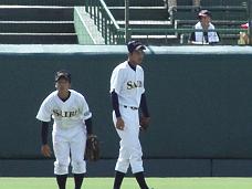 2004年甲子園球場正門横にて ホリ太郎写あの降雨ノーゲームから約一年後、ホリ太郎一行は関西・甲子園入りした。遡りその年の六月に友人の(御猿さん氏)が、唐突に言い放った『なあホリ太郎君、(ホリ太郎はここでは無視した)ホリ太郎主任!!(ここでホリ太郎が答える)なにかな!?御猿さん氏:今年向こうに行かないか?ホリ太郎:向こうの意味がわからんよ。御猿さん氏:甲子園だよ!!ホリ太郎君!!ホリ太郎:なるほどね。じゃあ(ミスター氏)も誘ってみるかい?御猿さん氏:そうだな』という訳で全道大会前に決まった甲子園行きで、その年の円山は何か違う風に見えた気がした。決勝こそ友人の結婚式で見れなかったがあわよくば甲子園で見れそうな気がした。 2004年甲子園正門前にて 係員おじさん写左から御猿さん氏・ホリ太郎・ミスター氏甲子園入りの前の佐実戦・特に日大三戦は現地で見たいが為、異様な空気が御猿さん氏の部屋に込めていた。岩田ー鈴木のリレーと打撃陣の粘りで辛くも勝利そして出発前日雨(この時点で決勝は日曜にずれる為 移動日程上見れなくなる)の為に初の観戦は東海山梨ー福島聖光になった。駒大は一日お預け。そして現地に入り正門方向へ(中央特自席は正門横で入場券が販売されている)するとプラカードで記念撮影している人が、、、。聞けば無料だし、係員のおじさんも感じが良かったので早速(駒沢)で一枚。すると見慣れたロゴが入った取材陣にインタビューを受けたホリ太郎でした。確かにあの当時は北海道のチームが上位進出は珍しいし、駒沢で記念写真の人も全く居なかったようだし(係員のおじさん談)2004年甲子園正門前 取材受けるホリ太郎 御猿写周りの関西人にも駒大はフロッグ扱いだったし、次の対戦相手は浜高で涌井だしテレビも親子鷹&済美・上甲で扱いは少なかった(少なくとも関西ではね)で球場入り2004年甲子園球場中央特別自席にて ホリ太郎写デカイ!!!しかも、、、言葉では言い表せないとにかく圧倒されたココで試合ができるなんて選手たちは幸せだなとか、いろいろ考えた2004年甲子園球場中央特自席にて ホリ太郎写とにかくグランドがとても広く感じるし、スタンドの大きさ・また球場外の建物が見えないから、スタンド・選手・大空と野球好きなにはたまらない光景がココには在るそれが甲子園のよさじゃないかな? 2004年甲子園 三塁側ベンチ ホリ太郎写試合は聖光・本間君が好投するも東海山梨・清水君の一打で試合が決まる。