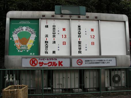 久々の書き込みです。その当時は日三高を下した駒大も次には消えるという雰囲気でした(周りの関西人にはかなりむかつきましたが)この日の対戦カードは第一試合・済美ー中京 第二試合・駒大苫小牧ー横浜甲子園球場にて ホリ太郎写正直言って中京は運が無いと感じた。特に小倉(P)も良く投げていたのにもかかわらず、中京攻撃中で試合の流れが掴みかけて雨天中断で逃げていった。試合の結果は済美が勝ち上がった甲子園球場にて ホリ太郎写甲子園球場にて ホリ太郎写そして準決勝の対戦がこのような対戦ボードが発表される。甲子園球場にて ホリ太郎写駒沢がとうとう甲子園で見れる。シートノック・まずまず硬さは無い。(横浜は駒沢のシートノックを見ていなかったが)後ろのオヤジは(今年の横浜は強いので北海道のチームかわいそうとの事)けれど試合は始まらないとわからない。初回出塁後はいつもと変わらない攻めで得点につながらないものの良い滑り出し、岩田のピッチングはかなり良い滑り出しもあり、少しずつ加点し先制・中押し・ダメ押し!けれど小心なホリ太郎は不安で仕方なったのだが岩田・鈴木のリレー&林のサイクルで快勝!初めていった関西で、、、たまらない一日を過ごしたのだった