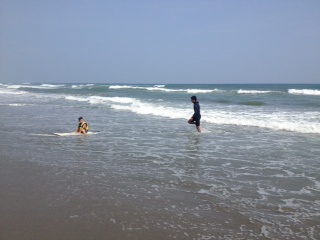19.20日と海へキャンプに行ってきました。 天気が良くてサイコーでした(≧∇≦) 海に入ったり砂遊びをしたり… ケイタは波を怖がってぜんぜんはいれませんでした。ひたすら日陰の砂の上を裸んぼでコロコロと転がってました( ̄▽ ̄)気持ちよかったみたい。 オウヤはパパとがんがん海に入ってました~ マイは一日目は入れませんでしたが…次の日には海に入れるようになりました(*^^*) みんなよく焼けて真っ黒になりました。 パパはサクサクとタープを張ってくれたり、火をおこしてくれたり、テント張ってくれたり…肉焼いてくれたり、昼ご飯準備してくれたり… 私は何にもしないで、のんびりさせてもらいました~ 時計と無縁の生活をさせてもらいました~( ̄▽ ̄) 旦那に感謝です。 自然の中で過ごすっていいですね~心地良かったです。