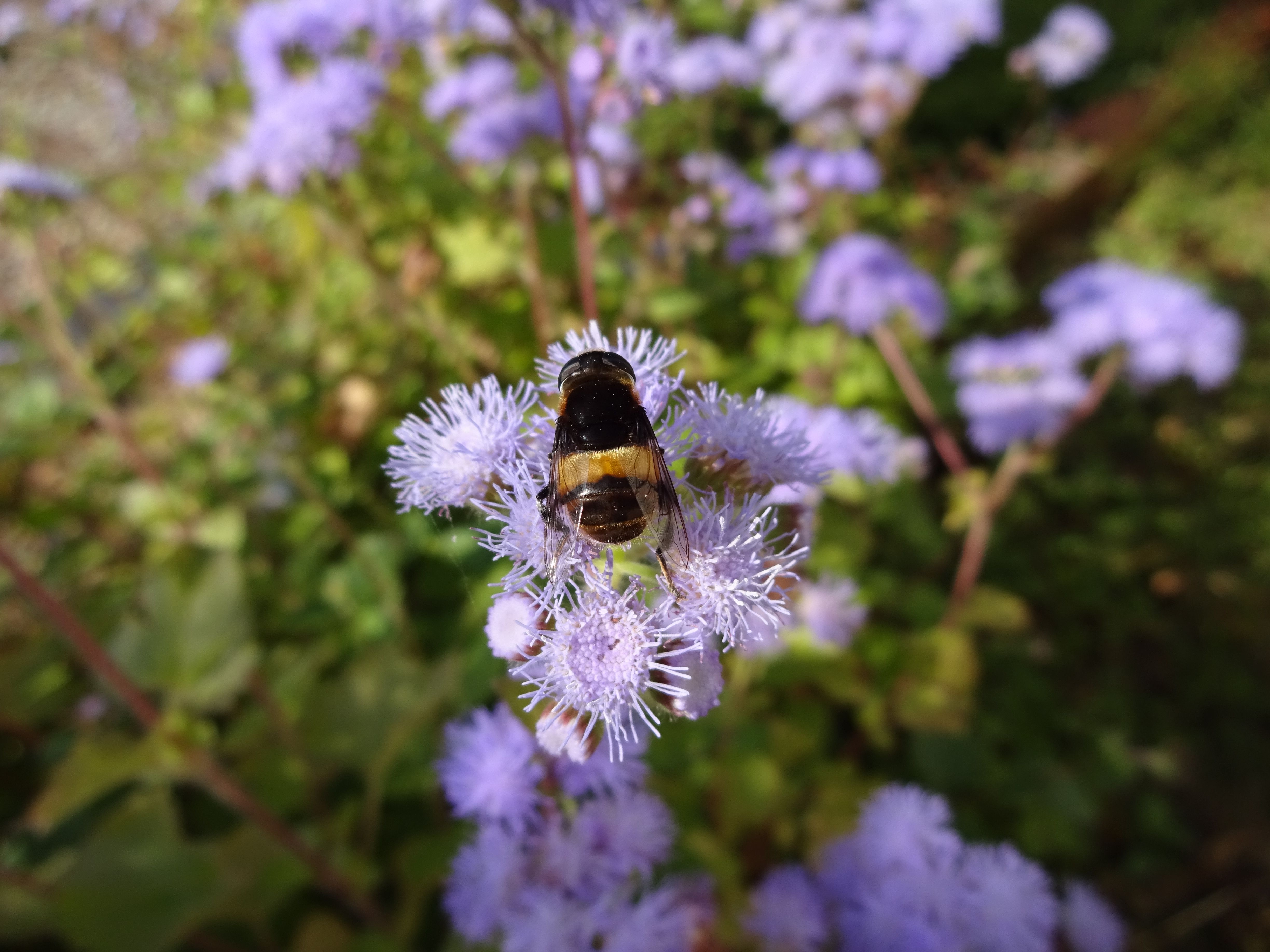 アゲラタムの花の上に蜂が止まっています。蜜を吸ってるの?