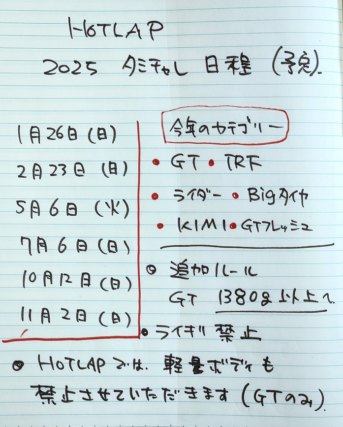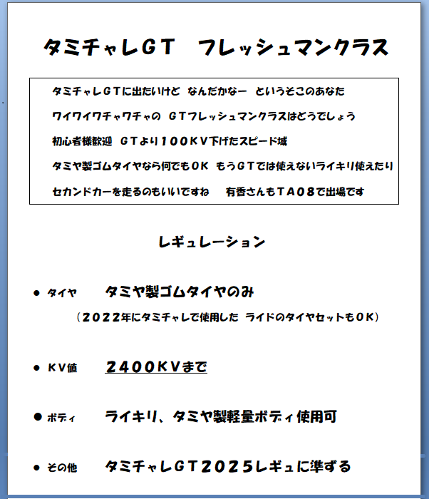 こんにちは HOTLAPです1月26日(日)に タミチャレ がございます2025年 第一戦目ですカテゴリーは6つ GT GTフレッシュ 新ビッグタイヤクラス KIMIライダー 最速のTRFクラス ですタミチャレ初心者様おすすめクラスです 新カテゴリーの ワチャワチャクラスです 楽しんでくださいバギークラスではなく ビッグタイヤクラスなので よろしくねヘイスト可になりました車重が 1212グラム以上になりました楽しいラジコンレースはこれ KIMI(他店様ではZEROですね)ライダーは 予選1回 決勝1回になっていますKIMIも予選1回 決勝1回 ビッグタイヤクラスは決勝のみうちのオリジナルタイヤクリーナー(ベタベタが付きにくくなる液)は使用できます2本 テーブルの上に置いておきますので そちらを使って頂いてもOKですPITオープン10時 練習11時00分より練習走行 おひとり3回まで レーススタート12時くらいレース終了17時前 エントリー1800円 Wエントリー以上プラス200円少しですが 親子割り などございます当日エントリーOKOK お気軽にご参加よろしくですランチは レースのカレーです 650円です事前予約受付中 よろしくです当日のカレーの注文締め切りは 11時まででお願いしますひぐちくん 渡辺さん カレー予約いれときました予選2回 決勝1回参加賞 必ず当たる豪華クジ引きありレース終了で お店 閉めさせていただきますので すいません体調わるいなぁ と思ったら家で休んでてくちなみに今年の年間予定はこんな感じですGTのポイントはこちら今年もよろしくね一応 タミグラ応援企画 フレッシュカーペット走行会とミニ四駆で遊ぼうの日 が6月29日 (日)に開催予定 1月 2月 5月のHOTLAPタミチャレにご参加いただくと 6月29日のみ使える 特別高額割引チケット1枚ずつ進呈 というやらしいプランもありますのよ