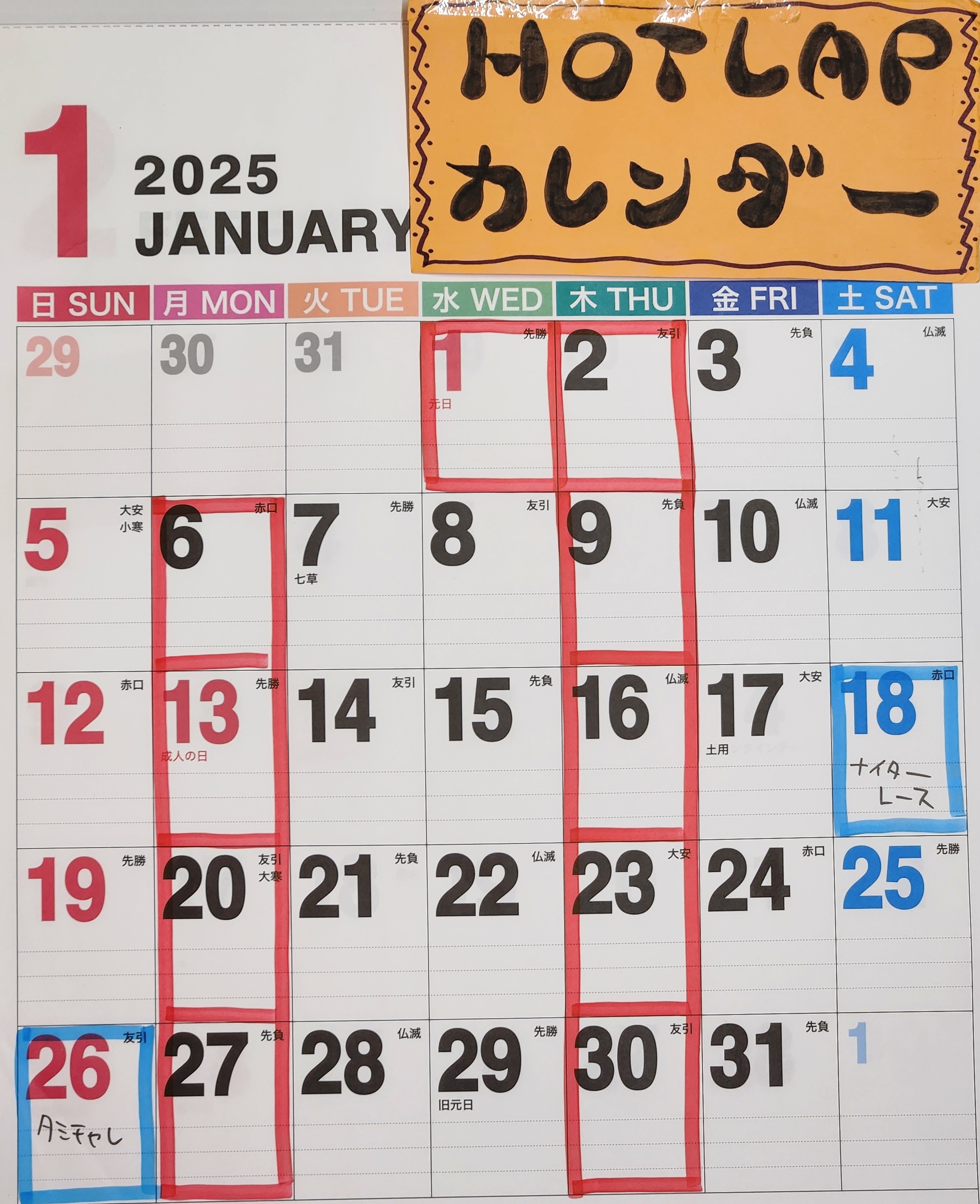 おはようございます HOTLAPです1月の予定カレンダー よろしくお願いします3日より営業させていただきます今年もよろしくね