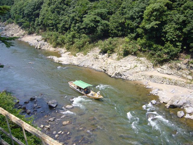 保津川下りは、亀岡から嵯峨まで16kmを約2時間で下ります。ただ、この所用時間は水量によって異なるらしく、梅雨で増水していた少し前の時期は1時間半くらいで下っていたところ、梅雨空け後、水量が減っていって、私が乗ったときは2時間かけて、ゆっくりと進んでいました。船頭さんが、「最高水位になったときなら10分くらいで嵐山まで行けますよ。我々は乗りませんが」と言っていました。 船は前と後に若い兄ちゃんが1人づついて、半分来たところで前後入れ替わっていました。船の先頭で竹竿を川底や岩に押し当てて船を進めるのですが、大変そうです。前にじいちゃんが櫓をこいでますが、このじいちゃんのこぎ方が下手くそ(櫓を水に入れる角度が悪い)で、前列3番目の席に座っていた私の所に水がばしゃばしゃ飛んできました。 これまで毎日毎日、何年も同じ話をしてドンドン洗練されていっているのでしょう、船頭さんの解説は要所要所に笑いをちりばめ楽しませてくれます。私が乗った船は団体客がおらず、こどもからご年輩の方まで乗船されていたので、船頭さんも「今日は年齢層が広く、笑いのツボが違うから、どのレベルで笑いをとるか難しい」などと言ってました。また、川底が深いところで、川底に向かって竹座を放り込み、浮力で竹竿が飛び出してきたところをキャッチしたり、長年竹竿を押し当てることによってできあがった岩の穴に狙い澄まして竹竿の先を突き刺したりというパフォーマンスも見せてくれました(下船後、女子大生らしき4人組が、若い船頭さん格好良かったと騒いでました。)。 炎天下で急流以外ではゆっくりと進め船の中で娘は気持ちよさそうに寝てしまいましたが、急流では歓声も沸き、楽しい2時間でした。 トロッコ列車からみた保津川下りの船