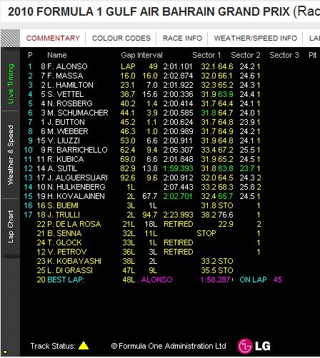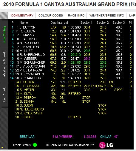 いや~なかなかの見ごたえでした。全てはベッテルのおかげですが...始まった時は地味な展開かと思いましたが...重くてアグレッシブではなかったですね~後半軽くなってからが勝負って感じ!フェラーリが前評判通り早かったけど、壊れなかったらベッテルとどういう勝負になったのか?見どころは多くてなかなかなレースでした~シューマッハも程々の順位でしたねあ、マッサも復帰レースでしたね、良かったです!そういえばやっとポイントがわかりました(笑)25,18,15,12,10,8,6,4,2,1なんですねトップ3くらいに入ってないと厳しいですね