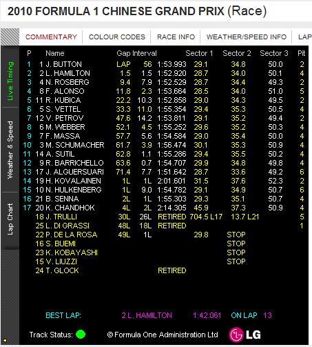 やっとベッテル勝ちました~!トラブルなければ最強だ!レッドブル1-2だし!小林は残念!もっと残念なのはアロンソか~前半ハミルトン、後半はアロンソが早かった~マッサは抜くのが下手なのか?何気にクビサがまた上位に~で、タイヤ交換義務は全チーム果たしたの?等など、予選が雨のおかげで追い越しありありで面白かったです~最後にひと雨でも良かったかな(笑)?