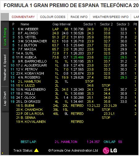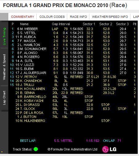 終わり~前半はアロンソ追い上げ~SC入って、入ってみたいな~んで後半はちょっとつまらない感じ~SC×2入ったけど、もうすっかり順位は確定って感じで、周回のみ消化長いレースだし、基本抜けないし、見ている方はモナコって正直イマイチ...