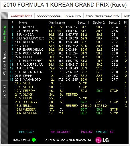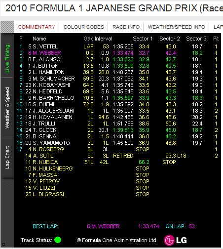 昼間見るF1もいいですね~リアルタイムっぽくてカムイの12位から7位へのオーバーテイクだけでも十分な見ごたえありでした!惜しむらくはアロンソにウェーバーを向いてもらうとチャンピオンシップが盛り上がったんだけど...