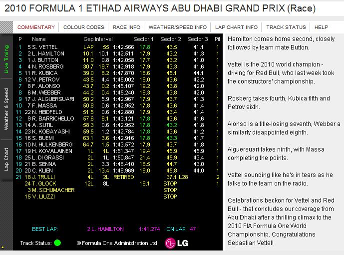 決まりましたね~!結構ビックリな結果やっぱり早い奴が勝つってことですねベッテルはリタイヤは多かったけど、マシントラブルがほとんどだったしねアロンソ/フェラーリは作戦ミスですね...フェラーリを応援していたけど、ダメですね積極性の差でした早いけど車壊れちゃうことが多くて可哀想でしたが、最後にチャンピオンになれて良かったのでは?可夢偉は入賞出来なかったけど、十分でしょう来シーズンを楽しみにしておきます今シーズンも終わりましたまた来年!