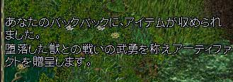 蛇男さん達に追い掛け回されてきました^^ 今日はJさんと一緒に。。。。。団子になってました団子になると敵をクリックするの大変ですね・・・・・マクロ組むかな・・・・ で、一個だけ獲得! 初めて出た! 使わないけど結構うれしい^^ 一日一個ぐらいのペース! 明日もでるかな^^