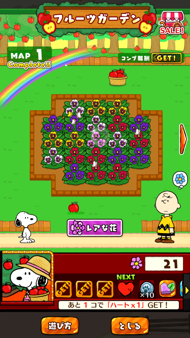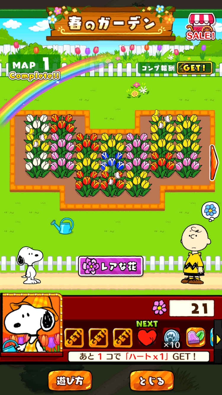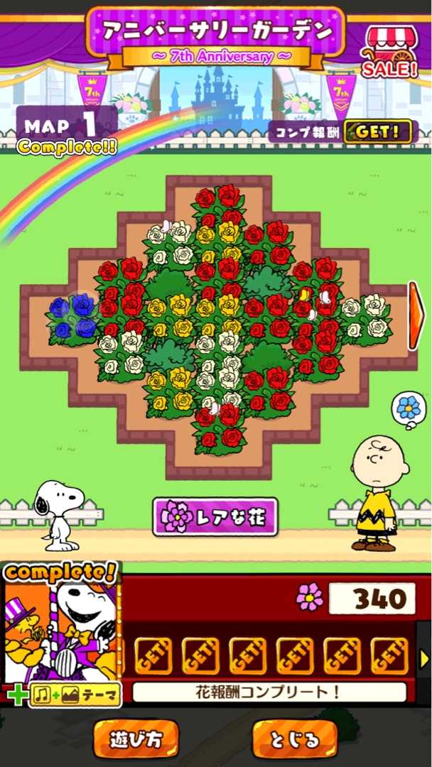 スヌーピードロップスの7周年イベントアニバーサリーガーデンがすごく可愛かった!レア花の青い薔薇は、1ガーデンで1つ咲いたり咲かなかったり・・(肥料は使わないこだわり) 青いバラが2つ咲いた! マップ11は全部咲かせる前にイベント期間が終了しましたー