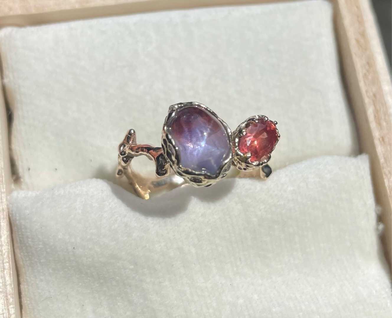 はしもとみおさんの展覧会のあと、またまた素敵な出会いがあり、買ってしまいました~もうね、石を見たら目がハートに!先日の横浜ミネラルザワールドで買った石の日記もまだなのに(写真が撮れていないの)スターサファイアとマラヤガーネットのリングです・・・もうね。めっちゃ綺麗。でも写真が上手く撮れない。もうあきらめた。まず惹かれたのは、この石座のデザインと作り方。デザイナーさんが丁寧に解説してくれたんだけど、フランスなどで仕入れたアンティークレースを使って型を取っているんだそう・・!珍しい!ポコポコ穴があいていたり、表面に絶妙なテクスチャがでているのは、レースの編み目がそのまま金で形取られているからなのです。鋳造の過程でレースは溶け落ちて、金がその形でとどまるのだそう。アンティークのレースが最後に役割を終えて、永久にかわらない金に姿を変えるなんて、ロマンがある話だなよくある、レースのくるんと尖った部分を、ちょうど爪にして石を留めるという、ものすごく繊細なつくりです。職人さんの手間もすごくかかっているということでした。アームは枝のような造形なのも、凝っていて好きなポイント。そして、なにより、サファイアがとっても透明度が高く、水の珠のよう。薄いモーヴ色と蒼色が混ざりあったような、モネの絵画のような不思議なカラー。そして・・・傾けると、ほのかにピンクも見える、バイカラー?の雰囲気も写真になかなか写せないの。。これがちょっと肉眼で見た感じに近いかな~ そして、、、かんじんのスターですが・・・ぜんぜん写せないっ! もぉーあきらめた。なんとなく、スターをとらえることができた写真。。太陽光の下では、2条のスターがビシっとみえます!なんやかんやで、室内のライトの下のほうが分かりやすく撮れたかも。とっても透明な石の表面に、光の筋が突然パぁーーーっと見える様は、本当に魔法の石のよう・・・ スターサファイアは、底がざらざらなんだとか。ざらざらの底のおかげで、光が反射してスターがでるんだって。それをつるつるに磨いてしまうと、スターが出なくなってしまう、とデザイナーさんが教えてくれた。最後に、手持ちのマラヤガーネットとの比較。やはり、もともと持っていたシャンパンピンクガーネットのほうは色が素晴らしいです。今回のガーネットは、ちょっとブラウンを噛んだオレンジって感じかな。蛍光灯と太陽とで色が変わって見えるので面白い