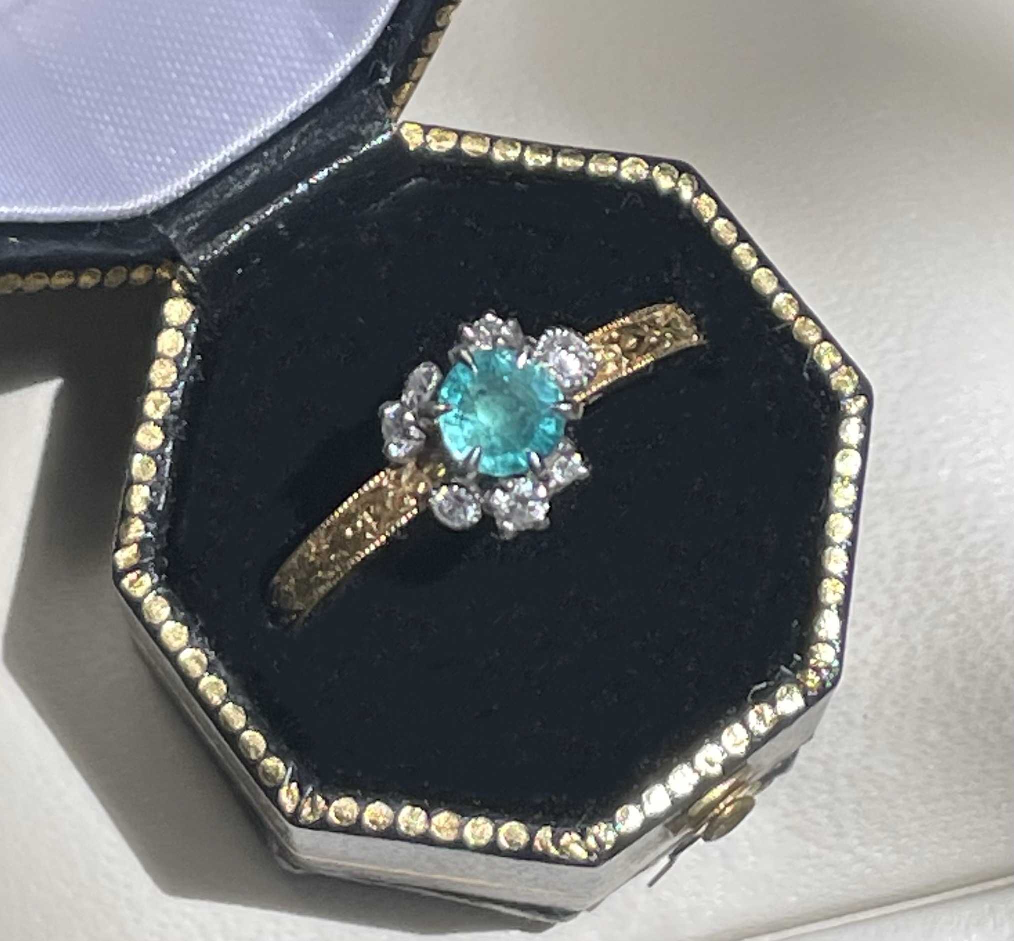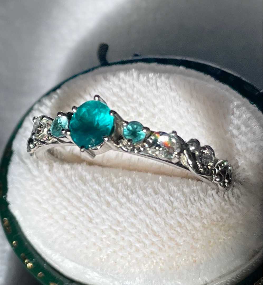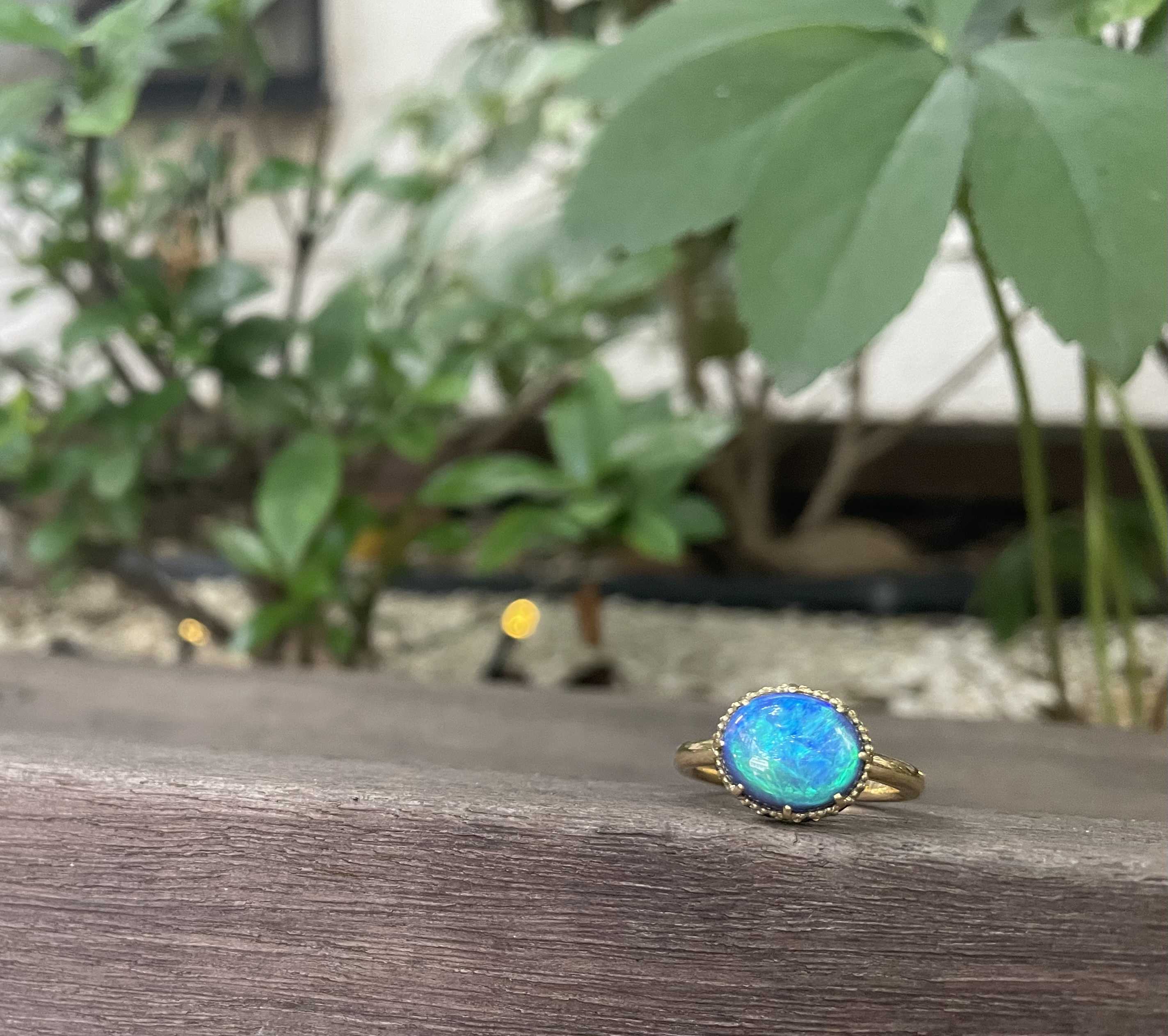 恐ろしく美しいリングをゲットしておりました。まるで地球のようなブラックオパールです。ずっとずっと、ブラックオパールは欲しかったんだけど、これ!というようなお品に巡り合えず、、手に入れずにおりました。わたしのブラックオパールの好みとしては、赤の斑は見えない、ブルーとグリーンがメインのもの。いろんな石をみて、赤がでるブラックオパールの方が高価だとされているけどあまり見た目としては好きじゃないなぁ、と。(赤やオレンジが出るならボルダーオパールのほうが好み)今回、出会ったこちらのお品は、大きさ、場面に広がる遊色、そしてリングのデザインと作り、、全てがパーフェクトに好みど真ん中でした見る角度により、浮かぶグリーンの様相が変化いたします・・・まるで宇宙からみた地球そのもの!指にはめた状態での、石の大きさや形の雰囲気が、まるで魔法がつかえそうかのよう。。。そして、とにかく、デザインが好きすぎる。この、石座のゴールドの薄さ。(伝わらない) 石を引き立てる石座。無骨な、CADリングにはない、手作りの精緻さ。指通りとはめ心地も他にはないリング。ぐるり1周、ブルーサファイアとエメラルドが交互に留められております。こんな凝ったリング、ほかにないよ!!!!輝きがほとんど写真に収められていませんが一生モノのの、ブラックオパールリングでした