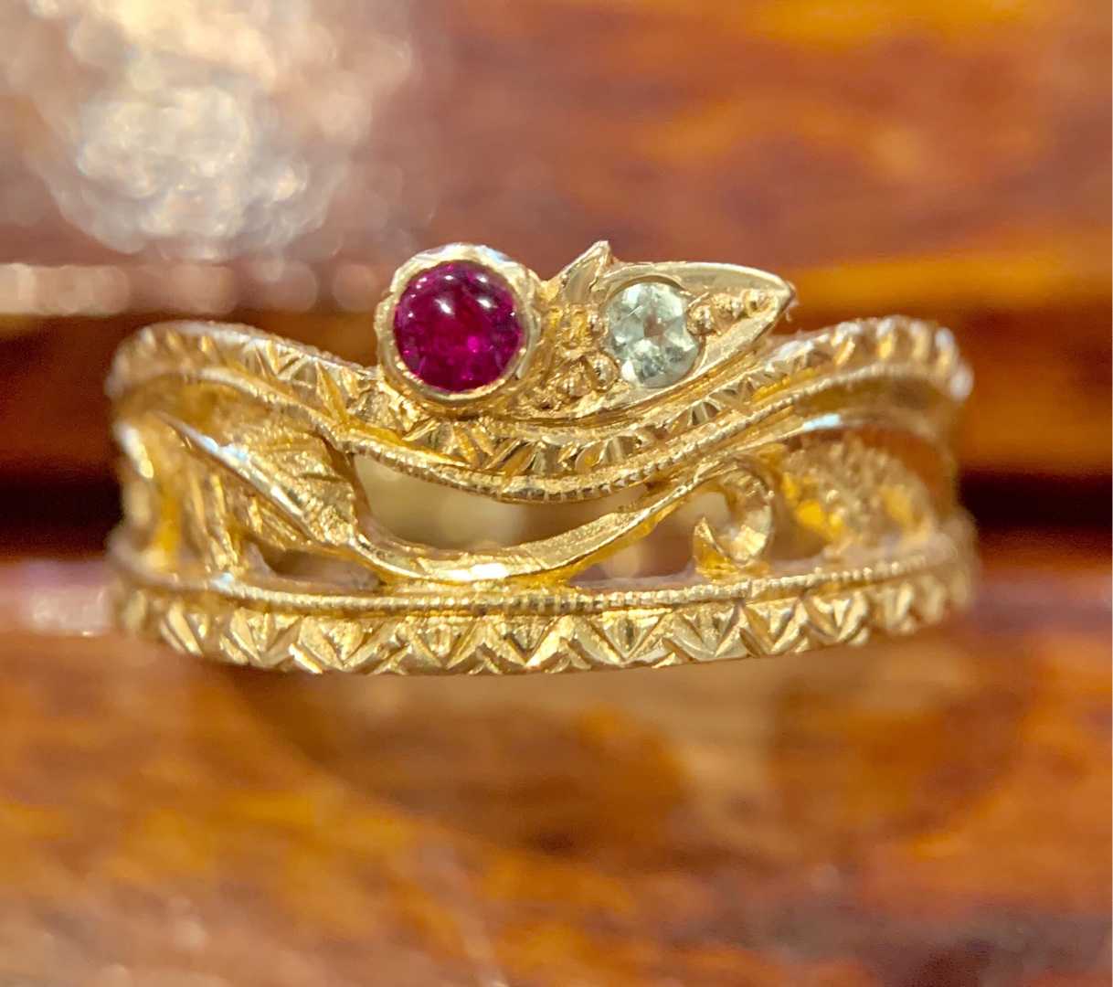 ずっと、彫りの入ったリングが何か欲しいな~と思っていました。フィレンツェ彫りとか和彫りとか。気にはなっていて、いつか、良い出会いがあれば良いな~と。この度、偶然お見かけしたポップアップショップで、衝動的にお買い上げしてしまいました。上半期予算をほとんど食いつぶしたリングはこいつだー!う・・・美しくないですか・・・??有機的な曲線のモチーフ透かし彫りが左右非対称で入っているのに対し、アームの上下に入った幾何学模様の彫りは指の腹の方までぐるりと全周入っています。あまりにも手の込んだ造りに、このお値段は安い!と思って決めてしまいました~ マクロレンズでどアップで撮ったけど、肉眼でみたら物凄く細かい彫り・・・すべて手作業でこれを作るのは途方もない作業だよね実は、とても似たデザインで、最後まで購入を迷ったリングもあり、そちらはローズカットダイアモンドがセッティングされていて、それがとてもキラキラして綺麗だった。でも、横の葉っぱのモチーフにあるのがグリーンガーネットで、それがちょっと・・・グリーンガーネットがエメラルドだったら、確実にダイアの方を買っただろう。決め手になったのは、「バフトップカットのルビーですよ」とデザイナーさんが説明してくれたこと。バフトップ??!!(@_@)!!じゃあ、買いまーす(*^▽^)/ てな感じになりましたよね「バフトップカット」って欲しかったのよね。セッティングされたら分からないけどさ。別にいいじゃん、私がこれがバフトップのルビーなんだ、ってわかってれば。それがロマンだよさらに、脇石がグリーンサファイアというのも、私としてはポイント高かった。結果、こちらを選んで大大満足。やっぱりルビーが一番好きな石であることには変わりはない!!妖艶な輝きは、ルビーならでは!最近、私の肌には、ピンクゴールドが一番合っているんだな、ということが分かってきた、、、ピンクゴールドは金としてはあまり好きではないんだけど普通の18金イエローゴールドが一番好きなんだけど、なんか着けると、マハラジャ感というか、アラビアンナイト感というか、、、なんかとにかく、”金GOLD着けてまーす”感がマシマシに見えてしまう気がして。。。でも気にせずつけるんだけどね。
