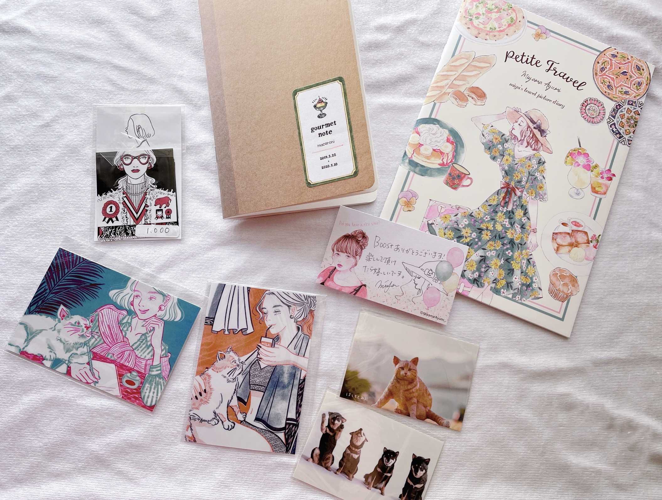 ここ数年でちまちま集めている絵描きさんの絵やグッズについてそのうち日記を。。。と思ってはいたんだけど、ぐずぐずしてずっと書いてなかったのでまとめて記録。とりあえずグッズから!でもこれはほんの一部だったわ!集合写真は、 ミヤマアユミさんのイラスト画集「Petit Travel」 マカロニさんのイラスト画集「gourmet note」 ニシイズミユカさんのポストカードなど(これ以外にももっとある) おまけのはしもとみおさんのカードマカロニさんの「gourmet note」Twitterで偶然イラストを見かけてまたたく間にファンになってしまった色んな街の美味しいものを描かれた色鉛筆画。色づかい、1ページの画面をめいっぱい使ったレイアウト、食べ物を美味しそうに描くって本当に難しいと思うんだけどセンスの塊!書き溜めたイラストを1冊の本にまとめたグッズとして販売される、という告知を見て、発売後すぐに購入した記憶がありますパラパラ見ているだけで時を忘れてしまいます。それに、このお店行ってみたいな~と思うお店も多いミヤマアユミさんの「Petit Travel」これは、、ずっと欲しくて、でも品切れで、再販してくれないかな~とずっと思っていた画集でした。ある時、わずかに残っていた予備?かなにかを在庫に戻して再販されたときに、ゲットできたのです!しかも、発売開始の時間を忘れていて、通勤電車のなかで慌てて購入手続きした気が・・・そのときラス1で、無事に買えてすごく嬉しかった!水彩画で細かい筆致の絵が溜息がでます。海外や国内の旅行先の旅ノートのような画集です。ミヤマアユミさんのはほかにもグッズを色々買ったけど、お花と女の子のイラストが多く、そちらも素敵だけど食べ物のイラストをたくさん見ることができる大満足の1冊でも、絵画好きとしては、、やっぱり肉筆画がほしいのよねいま、家の壁に飾ってある絵たち反射して映っちゃったおおかみとゴールデンレトリバーの絵は原画です。作家さんはそれぞれ違うけど、どちらの方も、出品されるとすぐ売り切れる人気の作家さんで、いつか欲しいとおもって狙っててゲットできた作品たちです。ゴールデンレトリバーのほうは、飼っていた犬にもよく似てるしとても明るい絵で大満足。狼のほうは、普通に素晴らしい絵。テクニカル的な意味で。できればこの方がゴールデンを描いてくれたらその絵をゲットしたかったんだけど、なかなか巡り合えず、あるとき、この絵が出品されていて、珍しくまだ売れておらずこれはタイミングかな、と思って購入しました。クオリティが素晴らしい絵です。右下がニシイズミユカさんのリソグラフこれは、立耳のワンで、ゴールデンとは違うのはわかってるんだけど、なんとなく、「わたしと犬」って相棒感漂う雰囲気が好きでお気に入りです。これは日本橋三越で個展イベントされていたときに買ったんだったかな~ニシイズミユカさんのも原画を狙って個展に何回か行ったけど、大人気でいつも売り切れ!!それも納得の原画の美しさでもリソグラフもとても綺麗です。いつかポートレートお願いしてみたい~~~!!!やっぱり原画よね~。最後に、先日吉祥寺のギャラリーで展示されていた、ミヤマアユミさんの原画。この、桜と置物の絵が一番好きだった。ミヤマアユミさんの原画も、いつかお迎えししたいのです。