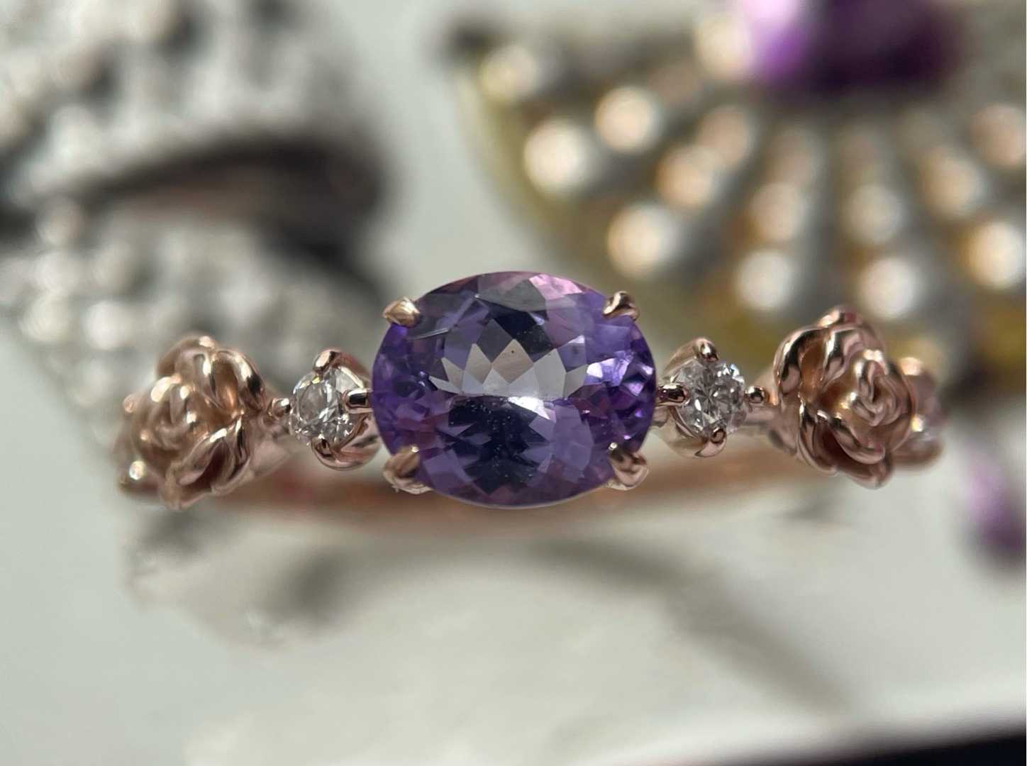 そうそう、ブルースミソナイトと一緒に、ラベンダーゾイサイトもリング加工に出したんでした。なんか安かったんで。7月に購入して、9月に加工したのは最短記録かもしれない!数年寝かされているルースたちがたくさんいるというのに。相変わらず色がぜんぜん違う写真です。かなりバイオレット寄りな色になっちゃってるな~ピンクもほのかに見えるゾイサイトなんだけどね今回めんどくさくて、青を抜く加工してないキラッキラ紫の薔薇のイメージだったので、薔薇モチーフがついている枠を選びました安定のピンクゴールドで。なかなか使いやすいリングです。ちょっと硬度が低いので取り扱い注意なのが難点