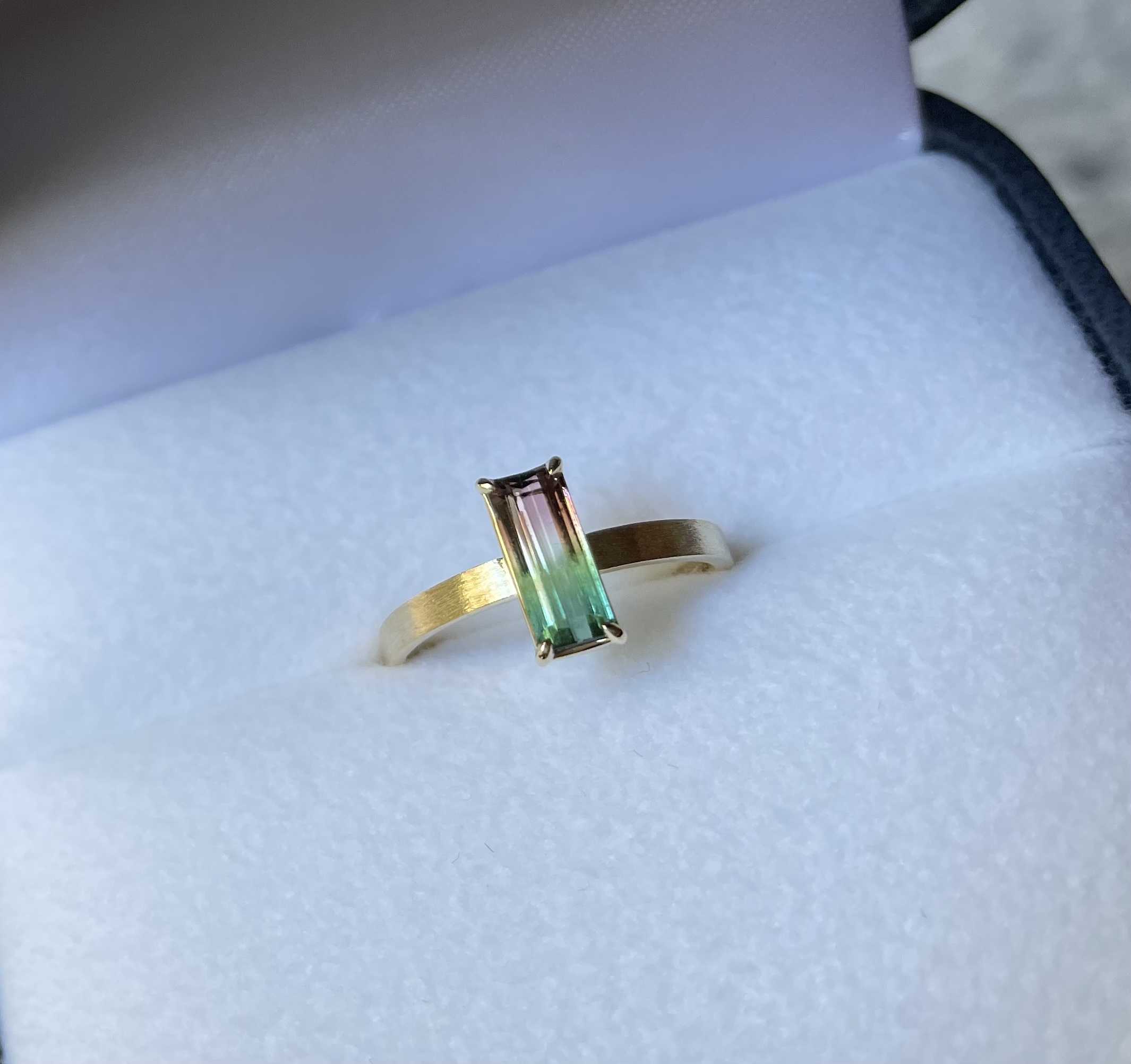 いつかは欲しいとずっと思っていた石を買ってそのまま気になっていたデザインでオーダーしました~~バイカラートルマリンのリングキリリッとしていませんか?色と石の大きさと、リングのデザインがあいまってなんとも洗練された雰囲気です。ずっとね、ピンクとグリーンのバイカラートルマリンがいつかは欲しかったのです桜の花と葉の色の組み合わせなかなか気に入る石を見つけられず、、、この石見た時は、これだ!と思ったのです。ほどよい大きさ、シャープな形、色がちょうど真ん中で変わっているのもよい。インクルージョンもほぼ見えず、綺麗な石トルマリンが生成されるどこかのタイミングで、地殻変動かはたまた隕石でも落ちたか・・・なんらかの出来事があって、途中で色が変わったんだよねそんな太古の昔に思いをはせると地球の神秘にワクワクしてしまうトルマリンならではの柱状の成長線も良く見える見てて飽きないです見えづらいんだけど、リングはものすごく細いヘアラインで横に彫りが入っていて、見た目以上に職人さんの手間がかかっている、めっちゃおしゃれなリングです。すごくカワイイラッピングでした。トルマリンの色をイメージしてくれたのかな~?この前、出張で行った飛行機の窓から雲海!徐々に高度を下げ・・・・陸が見えてきた!博多の街です。ビル群や車がミニチュアみたい。