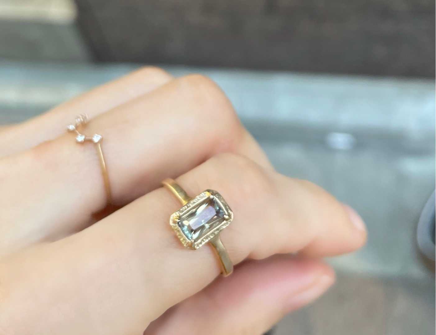 衝動買いしてしまった美しいダイアスポア・・・ぜんぜん見た通りの写真が撮れませ~ん笑 もう諦めたヨ好きなところをつらつらと書きます。まずは、太陽光の下、、、まったくもって目に映る通りの色が出ない!基本的には、薄いグリーン?グレーイッシュグリーン?なベースに、光の干渉で淡いオレンジのような?薄茶色が?見えます。そして高い分散性でキラピカと輝くのがなんとも美しい一番見えた感じに撮れた写真。直射日光下よりも日陰の方が、午前の光よりも夕方の光の方が、実物に近く撮れた気がする。。そして、蛍光灯の下では、薄い藤色。その奥にチラチラと黄色が見え隠れ。一般的な灯りでこの色なので、だいたい1日の中で目にする色はこの色になります。そ・・・そして、、白熱灯下では、、かなりビビッドなピンクに色が変わる!!色調整ぜんぜんしてないよ!なんか中央が抜けているように見えるんだけど、ペンライトで光を当てると光り過ぎて?抜けているように映るのです・・・目で見るとぜんぜん色抜けてないんだけど、、ビックリするほど妖艶な輝きじゃないですか・・・場面が広いのもよい!もうひとつ、色がもっと黄色味が強くなった褐色になる瞬間があったんだけど、どの光源でこの色になるのか分からず、写真撮れず。だって、ジムに行くエレベーターの中とかなんだもん、事例が。無理でしょ・・・1日中リングを着けてながらあちこち移動していると、今、何色かな~って手元に目をやるのが楽しくて仕方ない。かなりカラーレスに見える瞬間もある。不思議な石だ~こちらを買って1週間しか経っていないのに、今日もまた!ジュエリー買っちゃった!!毎週買っているんジャナイカ??!!ワハハ節制は、明日から!また日記書こう~