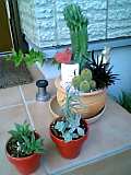 Kさんから頂いた、サボテンと多肉植物を植えなおしてみました。後ろのは、以前アップしたものですが、今回のは手前の赤い鉢二つこの赤い鉢、とっても気に入っていたので、何を植えるか楽しみにしていたんです。どうでしょう。。。かわいいでしょ?これは、ちょっと前にやった寄せ植え。小さいサボテンが上手く写っていないんだけど、かわった種類のものを買ったので、結構面白いなって思っています。でもね。。。バランスというか、全体の構成と色が気に入らないの。ふ~ん。どうしよう。