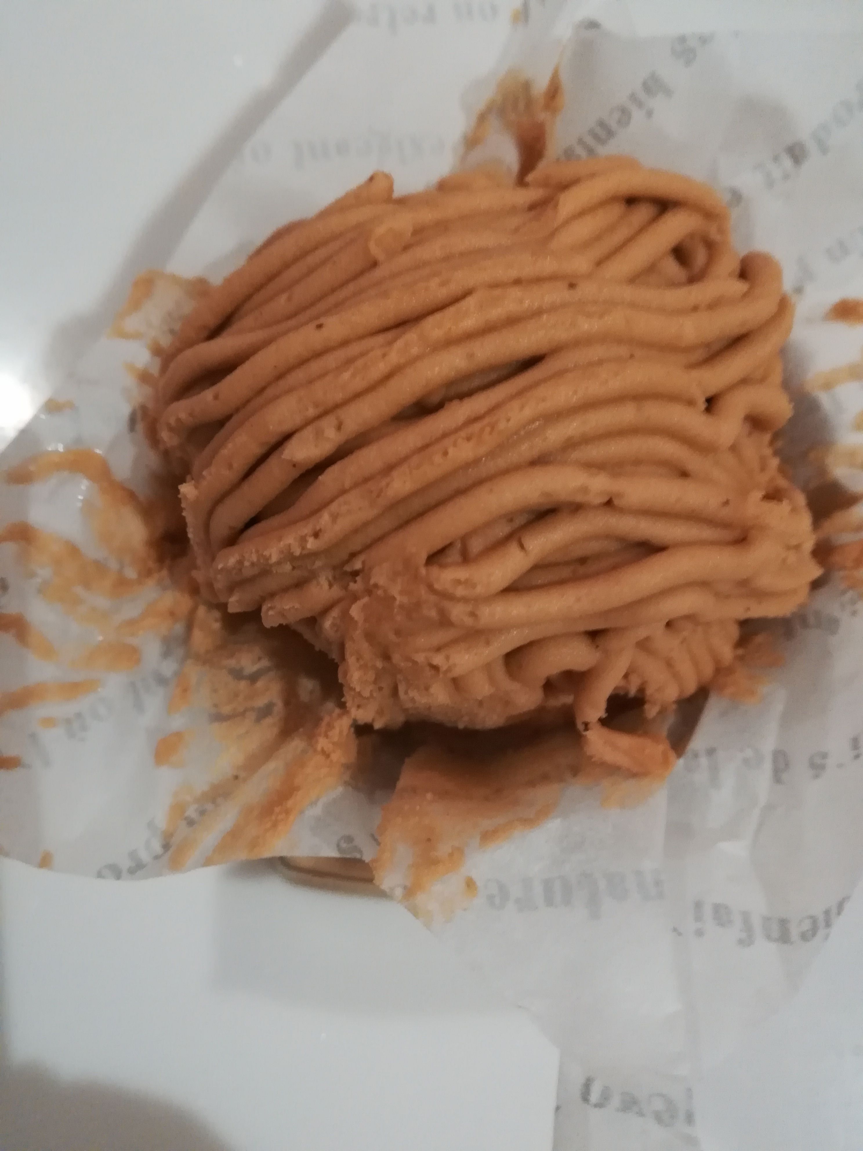 見た目がお気に入りのケーキ屋さんのモンブランにちょっと似ているけど、クリームの色やトップにマロングラッセが乗っていないところが違う