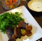 こんばんわ~、ニコライです~。(この日記の登場人物)先週は、ノジヲのお腹の具合が悪かったから、フロフキ大根とか白菜の漬け物とか湯豆腐とか食べてて、大した「ばんごはん」じゃなかったんだけど・・・(二人とも忘年会があったし)土曜日に近所のショッピングセンターに行って、そこの本屋で立ち読みして、一度は、本屋を後にしたのだが、やっぱり、どうしても美味しそうだから気になって買っちゃった料理本から、そっくり同じじゃないけど、インスパイアされて作った料理をご紹介するよ。●プルコギ風焼き肉、モヤシのスープ、キムチ 塩豚用の豚フィレ塊肉を薄くスライスしたお肉を、 前日からタレにつけた。 すり下ろしリンゴ・醤油・酒・ニンニク・生姜・胡麻油 プルコギ風のタレである。 炒める前に、玉葱と人参を加えて、10分ほど置いておいた。 サラダ菜にキムチと一緒に包んで食べたんだ。 モヤシのスープも韓国風で、これは本の通りに作ったよ♪何を買ったかというと・・・ ■コウケンテツの鍋、汁もの、煮込み(998円)ノジヲがソウルで腹下したばかりだというのに、なんで韓国料理!?と思うかも知れないが、ノジヲが、行き帰りの飛行機で、チューブのコチュジャンをゲットしてきたからなのだよ。韓国の人は、ゴハンにつけたりもするらしいんだが、今回のプルコギ風に、ちょっとコチュジャンをつけて食べても美味しい。コチュジャンは、ナゴヤンの「つけてみそかけてみそ」に近い感じだね。 ■つけてみそかけてみそ400gx5本入り(1575円)コウケンテツは、有名なイケメン料理研究家なのであるが、→■コウケンテツのオフィシャルブログ似た路線のお兄さん料理家だったら、ウニやんは、ケンタロウよりもコウケンテツの方が好きと言っていた。 ■ケンタロウのフライパンひとつでうれしい一週間!(1470円)↑この本、家にあるんだけど、いらない。誰か欲しい人、あげるよ。「ケンタロウの味付けが好みじゃないんだよ」ってさ。ケンタロウのレシピ通りに作るとイマイチなんで、自己流で味足しちゃう。コウケンテツの本は、難しい特別な調味料も使ってないし、その辺にありそうな普通の食材使ってて、しかも、いつも安い野菜を使った料理が多いんで、お役立ちだね♪写真がアンバーな感じで、他の鮮やかな明るい写真の料理本とは一線を画す、写真本としても、オサレっぽいエェ~感じの一冊でしゅ。ダイエット中の方には、写真本として、眺めて食べた気になることをオススメしましゅ。