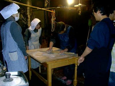 ■ 保育園での食と農のお話会がきっかけとなり、希望者による蕎麦道場が 開かれました。お父さんお母さんが4人集まって、500グラムの蕎麦をそれぞれが 自分の手で作ってみました。トクさんが最近マスターした、新しい作り方でやりました。 円く伸してやる方法より作りやすく誰にも上手に出来て、感動です。 おにかけ風の温かい蕎麦にして皆で美味しくいただきました。 自分で作った蕎麦500グラムはおみやげに持って帰る事が出来て参加者は大喜びでした。