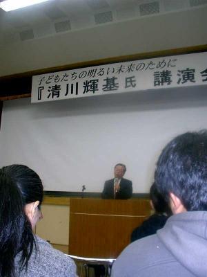 ケイ町で開かれた、清川輝基先生の講演会にあかりの会のメンバーと参加しました。 先生は「人間になれない子どもたち」の著者で,現在は塩田にある、不登校や引きこもり 高校生の通信制、単位制のフリースクール、さくら国際高校の校長先生をされいます。 先生が長年取り組んでおられる、メディア漬けの子ども達の実態と問題点そして 解決の方向を解りやすく話して戴きました。子どものメディア漬けは、子どもの幸せとは 程遠い、商業主義の人体実験である、とのお話に大人の責任を痛感しました。 ゲーム脳になってからでは遅い、毎日の暮らし方を自分自身問い直す、よい機会でした。 そして、子ども達にいっときだけでも、肉声で昔ばなしを聞かせてやることの意義を 再認識した講演会でした。
