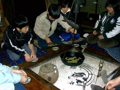 ■ 小学生が昔の暮らしを学びにいぶし庵へ来て、楽しそうに様々な物を見て感じ、 いろりの周りで語りを聞いて、楽しんで行きました。 初日はいろりの周りの道具類をめずらしそうに、見て、いろいろ質問していました。 自在鉤、のからくりを聞いて、ストッパーみたい、と歓声をあげたり、火箸や火消壷 を見て、火を消す様子をしっかり見ています。御餅を焼いたり魚を焼く わたし も 珍しい道具のようでした。カマドや薪ストーブ ランプ、そして あんどん に火を 点けるところも初めて見て、興味深深の様子。藁ずとに挿してある鯉の背びら焼きや 鮎の燻製を見て、おみやげに持ち帰ったり。 ほうろくで豆を炒っておくと、美味しそうに、お代わりして、食べています。 そして、おみやげに、と うれしそうに持ち帰って行きました。 語り2話 (豆を見て貰ってから) 豆と炭と藁 (仔猫を抱っこして) まわし猫 昔の暮らし学習 2回目