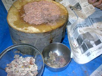 ■トクさんは昨日からキジ肉団子づくりに取り組んでいます。 明日の文化祭の昼食にキジ蕎麦を作るとか、お仲間の方がキジを提供して下さり 肉団子作りを楽しんでいました。 固い骨まですっかり砕いてどろどろ状態にしてから、団子に丸めるので、美味しい 出しが採れて、しかも肉団子も食べられるのです。無駄無く工夫された昔の料理には教えら れます。「肩がこっちゃった」と、言うながらも根気よく叩いていました。 鉄砲の玉が入っていても、叩く中で、木に打ち込まれていくので、大丈夫とか、 固い骨も木に打ち込まれてしまうとか、丸太を使う知恵にも感心します。