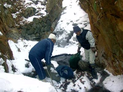 ■ 今年も寒晒し蕎麦をエス温泉んの渓流へ20日程晒しました。 1月11日にケイさんと二人で2袋晒して来ました。我が家は22キロです。 引き上げの時はロクさんが一緒に行ってくれたので、3人で引き上げる事が出来 大助かりでした。思ったより氷が薄くて作業は順調に出来ました。 家に帰って箱に広げてカンレイシャを掛けて雀避けをしてやりました。 寒の水に晒す、このひと手間を掛けることで、一味もふた味も美味しい蕎麦がいただける ので、毎年我が家の風物詩となっています。 完全に乾くまで、北の軒下に干しますので、雀に食べられないよう注意します。