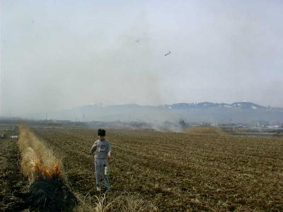 春恒例の用水ざらいと田んぼの土手焼き共同作業の日でした。 今年は、孫と3人で枯れ草の土手焼き作業の応援をしました。我が家は 大土手があるので、手間がかかります。 この作業は村中総出で一斉にやるので、あちこちから、煙が上り、炎が見えて、 地区一体が躍動感に溢れています。 いよいよ今年の米作り作業が始まりです。