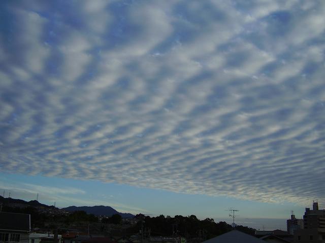 今日は 可燃ごみの日です。ごみをまとめて指定の場所へ・・・。おっと、今日の空の具合といったら・・・。こんなウロコ雲見たことな~い。とカメラを取りにダッシュしてパチリ。ちょっと感動。秋ですね~。