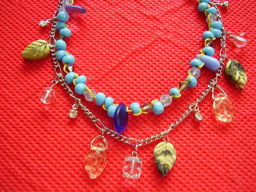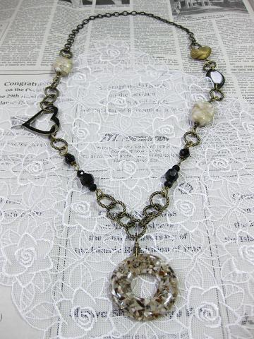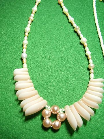 とーっても久しぶりのUPです 去年の暮あたりから、デジカメの調子が悪く2月の末から約2週間電気屋さんへ入院させていました。その間に、作り溜めたものたちです。フラワー型シェルとプラパーツでネックレス2種類長い方には一部リーフ型のシェルを使ってアクセントに。そのためリーフシェルは中心よりはずしてあります。短いほうは使ってあるプラパーツがすこーし違っているのですが、一緒に使ってもいいかもしれません。もうひとつグレーのプラスチックパールのつや消しと福袋にあったもの(たぶん水晶って書いてありました)を通しただけのネックレスで息抜き。あっワイヤーの端始末がまだだーっ!