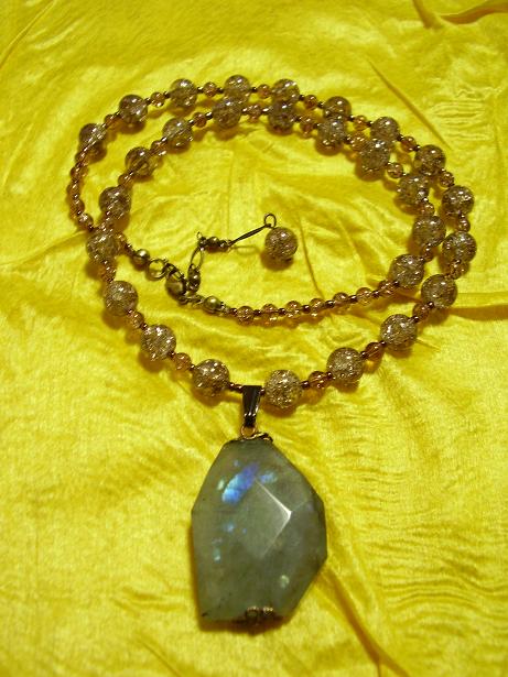 ラブラドライトはじめてこの石を使いました。全体的にモスグリーンなのですが、光の当たり具合によりブルーや虹彩色も見えます。ネック部分は革紐でチョーカー風にしようと思っていましたが、革紐が足りなくて…結局、ブラウンのクラックルビーズの大小でつなぎました。濃いブラウンでも、クラックルなのでそれなりに軽さも出て、何よりクラックルはやはりキラキラ感が最高コレはコレで気に入っています