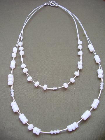 サボッてばかりのPureブログです。先々月、先月と漠然としたイメージに取り憑かれ、何もカタチにならず。最近は色に取り憑かれています。オレンジとイエローとグリーンから脱却出来ず、かといって作品も出来ずにいます。暑さのせいばかりにしていましたが、一度クリアにしようと、作りかけの作品とオレンジ・イエロー・グリーンのビーズを収納ボックスの奥へと隠しました。それから何も無い机にクリアのビーズ達とホワイト系のビーズ達とホワイトのワイヤーをのせ、テレビを見ながら、リラックスした状況を作り、気の向くままにとりあえずワイヤーにスルー。…で何とかモノに仕上げてみようと、こんなものが出来ました 何もかも白紙に戻して…って「白かよ!」みたいな作品です 今日も暑い。秋が待ち遠しいですね。私の好きなお店「アクセサリー通り」で秋物パーツ探してみませんか
