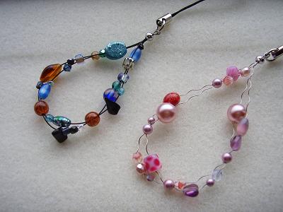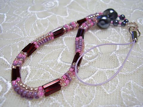 これもGWに作ったものです。 ビーズ・ニュースプラチナの付録に刺激されて同じレシピで青黒系とピンク系にしました。ピンク系の方は波線ワイヤーで色プラスでより柔らかいイメージに仕上げたつもりです。付録のストラップはスワロがふんだんに使われていてさすがの輝きでMyを飾っています。ストラップは久しぶりです。一応男性用女性用として作り、お世話になっているご夫婦に差し上げるつもりでしたが、勢いでお隣の姉妹にプレゼントしてしまいました。