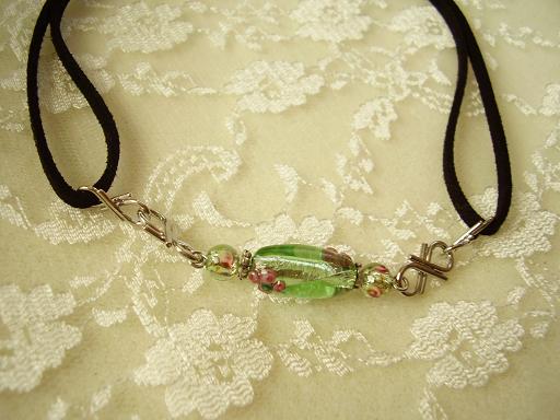とても久しぶりのUPです。なかなかUPできませんでした。歯の詰め物が取れたところを数年ほったらかしていたのですが、なんとなく違和感を感じるようになり、歯医者さん通い・・・、などなどバタバタしておりました。先月、広島三越で開催されていた”イタリアフェア”へ、ちょこっと行ってみました。その時に購入したグリーンのヴェネチアンをチョーカーにしてみました。最初は、太い丸皮紐で作ってみたのですが、落ち着きが悪く、平レザー紐2本取りで首に添うように作り変えました。黒とシルバーとグリーンなので何色の服でもきっと合わせやすいと思います。義妹へのプレゼントにしようと思っているところです。