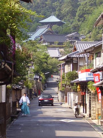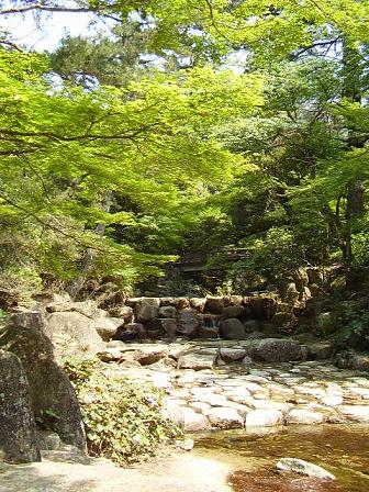 昨日は宮島へお散歩へ行きました。 ちなみにこのPhotoは昨日ではありません。昨日は少~し霞んでいたので残念でした。昨日は、いつもよりちょっと早めに家を出て、7時40分のフェリーで渡ったので、お店も何も閑散としていました。しかしそのおかげで、町屋あたりの写真がたくさん撮れました。この写真は町屋通りから見た五重塔です。普通は厳島神社入り口あたりから見上げるところです。 いつもは観光客でいっぱいの商店街です。 この商店街(おみやげ物屋さん)に、つるしてあるのがこんな花かごです。他にも赤のかごの通りや黄色のかごの通りなどもあります。この町並みの、そこかしこにこんな路地もあります。観光客の多い時間には見ることは出来ないとこですね。 裏通りを歩くと、こんなお寺や神社もあります。老舗の旅館です。朝日に映えてとてもきれいでした。今はもみじの花が満開です。もみじの花です。 老舗旅館の庭。この橋を左へ渡ると紅葉谷へ続きます。 とてもお天気がよくGWほど観光客もいなくてさわやかなお散歩でした。