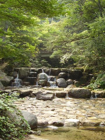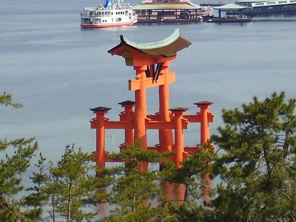 セミの声に迎えられてフェリーで世界遺産の宮島へ上陸。午前9時頃でしたが、島はマイナスイオンにあふれていて、清々しい空気です。いつものように、紅葉谷へと続く車道を散歩。紅葉谷公園へ着くと汗をぬぐうのも忘れそうな景色が待っていました。真夏の紅葉谷谷の中の小さな滝もう秋?紅葉山の遊歩道から水族館前に下りてゆくと、広場に観光客が何人かいて騒いでいました。カメラを構えている人がいたのでその先を見ると、なんと子タヌキがいます。宮島は島のほとんどが原生林なのでタヌキがいても不思議はないのですが、こんなに人がたくさんいるところへ出てくるなんて・・・とても珍しいので、一枚撮っておきました。その後、厳島神社の廻りを歩いていますと、こんな綺麗な船が神社の中に係留されています。この船は明日の管絃祭(かんげんさい)というお祭りで使用される御座船です。とてもきれいな船でした。毎年あるお祭りですが、たいてい平日の夜なので船を昼間見たことはありませんでした。感激!どういうお祭りなのか詳しくはわからないので、こちらでどうぞhttp://www.miyajima-wch.jp/管絃祭の後も夏の行事があるみたいです。お祭りのポスター夏に宮島へ行くのは午前中がオススメです。観光地はほとんど島の西側に集中しているので午後はとても暑いと思います。ただし海水浴場の包ケ浦は東側にあります。わずか2時間程度の散歩&散策ですが、かなり宮島に癒されました。