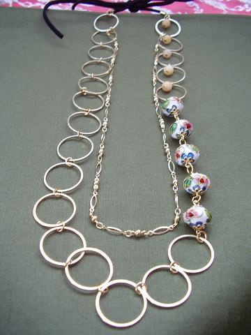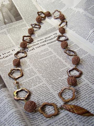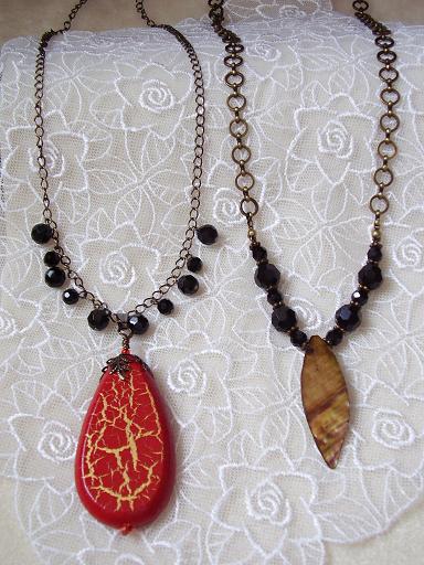 訪問ありがとうございます各地で大雨の被害に遭われた方にはお見舞い申し上げます夏期休暇を終えて2週間、のまわるような仕事の忙しさがつづいていました ふぅぅその中で、時間を見つけては作った作品2点です。夏期休暇が明けると 途端に涼しく(寒く?)なったので無意識に”秋”の色のものです。その1 4月頃に作ったネックレスをリフォーム元はコレ元は革紐が太すぎて・・・ハハこうなりましたその2一応シェルとブラックオブシディアン(黒曜石)とかいう天然石です