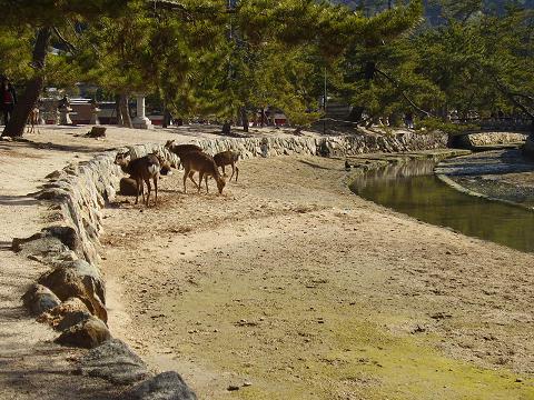 宮島散策(その4)山の遊歩道から下り海岸沿いへ、鹿たちが小川のそばでひなたぼっこ。大鳥居を眺めながら、テレビの番組で得た情報の確認。鳥居の側面の“絵”「西側は三日月東側は太陽」テレビではじめて知った事実に納得でした。